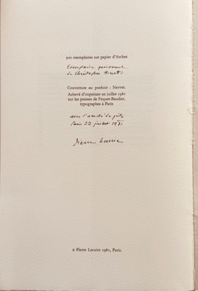 9/F bis - LIVRE DE PIERRE LECUIRE - Institut Français d'Athènes - Catalogue 1981 - Dedicated to Christopher Hewett - Unique –